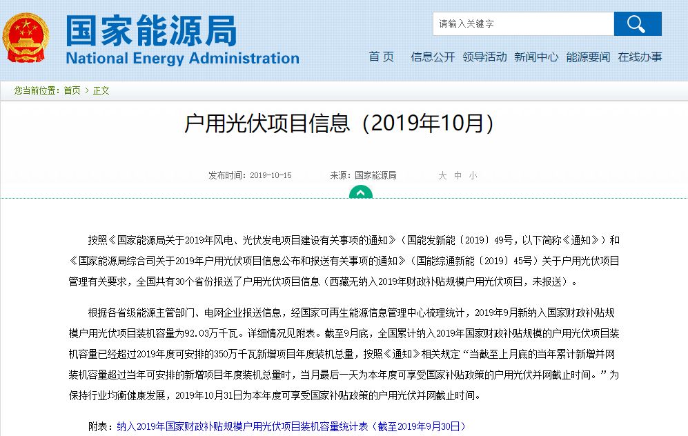 【新政聚焦】國家能(néng)源(yuán)局發布:2019年戶用指標光伏指標(biāo)10月底截止,11月並網項目暫無補(bǔ)貼2019-10-1691网站光電下載文(wén)件:暫時沒(méi)有下載(zǎi)文件