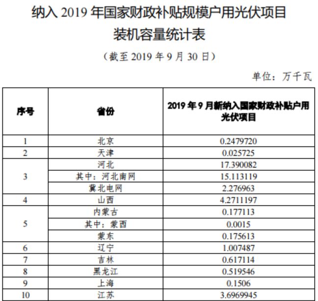 根據各省級能源主管部門、電網(wǎng)企(qǐ)業報送信息,經國家可再生能源信息管理中心梳理(lǐ)統(tǒng)計,2019年9月新納入國家財政補貼規模戶用光(guāng)伏項目裝機容量為92.03萬千瓦。詳細情況見附表。 截至9月底,全國累計納入2019年國家財政補貼規模的戶用光伏項目裝機容量已經超過2019年度可安排的350萬千瓦新增項(xiàng)目年度(dù)裝機總量,按照《通知》相(xiàng)關(guān)規定“當截至上(shàng)月底的(de)當年累計新增並網裝機容量超過當年可安排的新增(zēng)項目年度(dù)裝機總量時,當月最後一(yī)天為本(běn)年度可(kě)享受國家補貼政(zhèng)策的戶用光伏並網截止時間。” 為保持行業均衡健康發展,2019年10月31日為本年度可享受國家(jiā)補貼政策的戶用光伏(fú)並網截(jié)止時間。 據統計:山東9月新納入國家財(cái)政補(bǔ)貼戶(hù)用光伏(fú)項目納入(rù)補貼的光伏項目占總和的40%,排名全國第一。 能源(yuán)局在文件中明確指出:2019年10月31日為本年度可享受國家(jiā)補(bǔ)貼政策的戶(hù)用光(guāng)伏並網截止時間。 即10月31日為戶用光伏並網最後(hòu)截止時間,在10月31日之(zhī)後並網的戶用光伏電站,由於2020年光伏管理政策還未(wèi)出台,從(cóng)目前政策來看,暫時拿不到0.18元/度的戶用光伏補貼(tiē)。 11月以後的戶用電站,待有關部(bù)門廣泛征求意見後統籌研究決定。 根據不少光(guāng)伏人的反(fǎn)饋,有些(xiē)地方的電網公司在9月底(dǐ)或者10月初已經停止光伏備(bèi)案、並網,特別提醒: 最新數據顯示:截止9月底,戶(hù)用指標已經(jīng)累計達到4277.36MW。 今(jīn)年戶用(yòng)補貼金(jīn)額是(shì)7.5億(yì)元,有朋友(yǒu)擔心,戶用指標3.5GW,超出裝機範圍的電站怎麽辦?能否拿到補貼?可以(yǐ)放心的是(shì),從去年531之(zhī)後到今年10月31日截止,安裝的戶用電站都可以拿到0.18元/度的國(guó)家補貼。 注:2018年5月(yuè)31日前備案,2018年6月30日前並網的戶用光伏(fú)補貼是0.37元/度。 首先明確一點,今(jīn)年國家財政單獨拿出來7.5個億給戶用光伏項目,補貼0.18元/度肯定(dìng)會有(yǒu)。光伏扶貧項目和戶用光(guāng)伏補(bǔ)貼相比於其(qí)他的光伏項目,會優先(xiān)下發。 現在,陸陸續續也有一些(xiē)地方收到戶用光(guāng)伏的補貼資(zī)金了。如果你還沒有收到補貼,可以再等一等,不放(fàng)心可以到當地供電(diàn)局問問情況,或者撥打12398谘詢。 現階段來(lái)看,由於戶用光伏電站(zhàn)的安裝成本較(jiào)高,暫時還達不(bú)到平價上網的要求。明年戶用電站應該(gāi)還會有(yǒu)補(bǔ)貼(tiē)。 隨著(zhe)技術革新進步,光伏設備的價格也將不斷下降,這樣電站裝機的成(chéng)本就會(huì)更低(dī)。相信用不了多久,光伏行業就會(huì)走向無補(bǔ)貼的時(shí)代,脫離了補貼的束縛,我們將會麵對一個更大、更廣闊的市場。未來“光伏+”的應用(yòng)會變得更多,人們不再看隻重(chóng)光伏的(de)金融價值,會更多考慮光(guāng)伏(fú)的實用性和功能性!